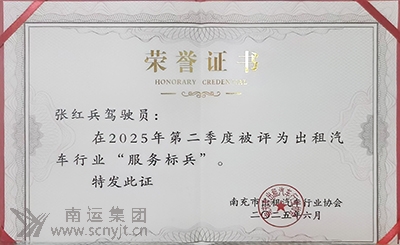 南運(yùn)鴻運(yùn)的哥張紅兵榮獲2025年南充市出租汽車行業(yè) 第二季度“服務(wù)標(biāo)兵”稱號(hào)