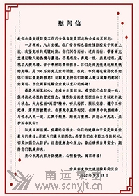 尊敬的市交通運(yùn)輸局黨委: 在投入鄰水緊張的抗疫工作間隙,我們南運(yùn)集團(tuán)奔赴鄰水抗疫一線的22名黨員先鋒隊(duì)駕駛員及領(lǐng)隊(duì),懷著激動(dòng)地心情傳達(dá)閱讀了市交通運(yùn)輸局黨委給我們發(fā)的既熱情洋溢鼓舞斗志,又充滿溫暖深情牽掛的《慰問信》,讓我們勇氣倍增,更加堅(jiān)定了圓滿完成支援鄰水防疫任務(wù)的信心和決心,在此謹(jǐn)代表南運(yùn)集團(tuán)出征鄰水的全體黨員先鋒隊(duì)駕駛員及領(lǐng)隊(duì)向局黨委的親切關(guān)懷和暖心慰問表示衷心感謝! 請(qǐng)局黨委放心,我們?cè)卩徦挂咭痪,一定不忘初心,牢記使命,只爭(zhēng)朝夕,不負(fù)韶華,聽從當(dāng)?shù)刂笓],服從工作安排,遵守防疫紀(jì)律,落實(shí)防控要求,加強(qiáng)個(gè)人防護(hù),確保自身安全,充分展現(xiàn)南充交通人的大愛情懷,上下一心,眾志成城,全力以赴打贏疫情防控殲滅戰(zhàn)!為鄰水防疫工作做出應(yīng)有貢獻(xiàn)! 上下同欲者勝,風(fēng)雨同舟者興。請(qǐng)局黨委相信:在市委市政府的正確領(lǐng)導(dǎo)下,在市局黨委的堅(jiān)定支持下,我們絕不辜負(fù)市局黨委和南充人民的信任重托和殷切希望!堅(jiān)決確保圓滿完成上級(jí)黨組織交給我們的抗疫運(yùn)輸保障光榮任務(wù)!為南充人民爭(zhēng)光!為南充交通爭(zhēng)光! 此致敬禮! 南運(yùn)集團(tuán)赴鄰水抗疫一線黨員先鋒隊(duì)全體駕駛員 2022年5月18日晚十一時(shí)