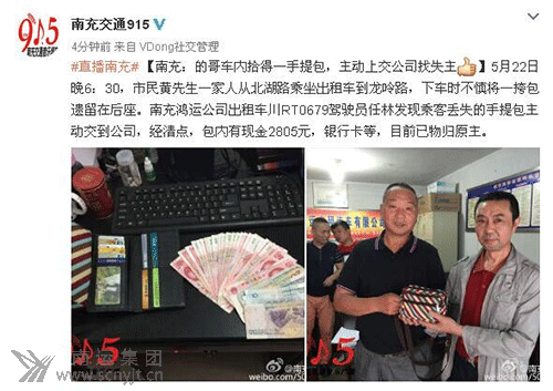 5月22日晚6:30,市民黃先生一家從北湖路乘坐出租車到龍吟路,下車時不慎將一挎包遺留在后座。南運集團南充鴻運出租汽車川RT0679駕駛員任林發(fā)現(xiàn)后,主動將乘客遺失的挎包交到公司,經(jīng)公司管理人員當面清點,包內(nèi)有現(xiàn)金2805.00元,已及銀行卡等。經(jīng)多方聯(lián)系后,乘客遺失財物已物歸原主。