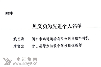 2020年12月底,經六屆南充市人民政府第144次常務會議審議通過,決定對姚長海、唐富業(yè)2名見義勇為先進個人進行獎勵,每人0.5萬元人民幣,并下發(fā)《關于對姚長海等2名見義勇為先進個人進行獎勵的決定》(南府發(fā)〔2020〕12號)。 姚長海52歲,蓬安人,現為南運集團閬中鴻運運輸有限公司里一名出租車駕駛員。2018年11月26日上午,姚長海在搭乘一名女孩時,發(fā)現該女孩滿面淚痕,于是他在途中勸導女孩,可對方并不回應,女孩下車時將車費交到姚長海手中便迅速離去。姚長海感覺情況異常,于是將車停在路邊,下車尋找女孩。在尋至嘉陵江邊時,姚長海發(fā)現女孩已經跳江,于是他奮不顧身躍入冰冷的江水中奮力施救,最終在岸上群眾的幫助下把輕生女孩救上岸,讓正處花季的生命得以延續(xù)。 姚長海不但多次見義勇為,他在平時的營運過程中也始終堅持做到扶老攜幼、熱情服務、文明待客,從不欺客宰客、從不拒載;凡拾到乘客遺失的物品,他都立即聯(lián)系失主或上交公司;每年高考,他都積極參加公司組織的免費送考服務;在同事遇到困難時,他都會出手幫一把。他總是說:“誰沒有困難的時候,自己能幫一把就幫一把”。 姚長海在寒冷的嘉陵江中將17歲輕生女孩救上岸的英勇壯舉在《中央電視臺》《人民日報》《新華社》《新京報》《四川日報》等全國300多家新聞媒體和網絡平臺廣為報道,在全中國產生了廣泛的影響;他見義勇為和平時拾金不昧及助人為樂的先進事跡感動了社會,獲得了應有的榮譽和獎勵。他曾入選“2018年感動南充十大新聞人物”,先后被評為“閬中好人”、“最帥的哥”,并獲得阿里巴巴“2018年度正能量人物”和獎金1萬元;2019年他被評為“四川好人”,2020年獲得南充市政府的表彰和獎勵。 姚長海作為南運集團出租車駕駛員,為南充出租行業(yè)爭了光,為社會、也為出租車駕駛員及公司員工樹立了良好的榜樣。希望廣大員工向姚長海同志學習,做一個樂于助人、道德高尚、受人尊敬的人,為提升企業(yè)形象、建設平安南充作出新的更大貢獻。
