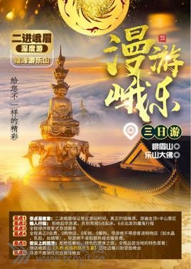 第一天:當?shù)?成都 宿:成都市區(qū)指定酒店 第二天:成都—峨眉山 宿:峨眉山半山 06:30成都三環(huán)內(nèi)接(到酒店接站時間預計提前1小時左右),07:30在成都市武侯區(qū)高朋東路附近集合出發(fā),上車后繼續(xù)小睡,經(jīng)過 2 小時30分后抵達佛國仙山峨眉山。 (溫馨提示:旺季因旅游人數(shù)較多,為避免您到達景區(qū)后耗時排隊過長,可能會提前出發(fā),請配合導游工作;具體集合時間和地點以導游通知為準。 11:30萬年寺停車場午餐品嘗【地道峨樂小吃宴】以樂山峨眉山當?shù)卣诿〕詾橹鞯牟停鲏味垢、甜皮鴨等?jīng)典特色美食 ,贈送嘉州豆腐腦+仙山凍粑。 后搭乘景區(qū)環(huán)保觀光車(觀光車費自理90/人)上山,前往雷洞坪。 13:30到達雷洞坪停車場,步行1.5公里到【接引殿】(途中會路過一個野生猴區(qū)分布地,可觀賞野生猴子,請注意在觀賞時不要靠太近,喂食等),乘索道【索道費用自理65/人】上【金頂】,朝拜【十方普賢圣像】,參觀金頂【華藏寺】和 “銀殿”【臥云庵】,天氣晴好時還可遙望遠方的貢嘎峰;游覽【金剛嘴】【舍身崖】等景點,運氣好時有幸遇到佛光。游完金頂后乘下行索道【索道費用自理55/人】按原路返回雷洞坪停車場。 16:30乘景區(qū)觀光車下山前往半山,入住酒店。 18:00品嘗當?shù)仞B(yǎng)生餐-【久養(yǎng).峨眉藥膳養(yǎng)生宴】,觀看匯集全川的民間藝術精品,彝族舞蹈,皮筋,吐火,魔術,舞蹈乖幺妹兒,讓此次旅行有顏有味。溫馨提示如果因特殊原因排隊堵車等等下山晚,表演取消,贈送項目無費用退。 峨眉山野生中藥材+生態(tài)跑山雞耗費5小時精心熬制鍋底。主菜:年份生態(tài)雞一只2.5斤、晶髈蹄名(肘子500g)、養(yǎng)生肉丸(10個)、精品五花肉(250g)、峨眉香酥(250g)、美好火腿(250g)、鵪鶉蛋1份、山藥1份、冬瓜1份、米粉1份、竹筍1份、泉水豆腐1份、青菜葉子2份、竹蓀1份、時素拼盤1份、面條1份、水果拼盤1份。 第三天: 峨眉山—樂山大佛—成都-當?shù)?/span> 06:30在酒店用早餐(或路早),辦理退房手續(xù)。 07:00餐后乘索道【索道費用自理65/人】上行至萬年索道站,步行至普賢菩薩道場---萬年寺,游覽被喻為“白水秋風”的【萬年寺】【萬年寺門票自理10元/人】,在寺內(nèi)參觀峨眉山鎮(zhèn)山之寶重達62噸的【普賢神像】,下行至白娘子修道成仙的【白龍洞】、【清音閣】、【清音平湖】、【黑龍江棧道】、【一線天】、【自然生態(tài)猴區(qū)】,后按原路返回到清音閣,然后至五顯崗。{黑龍江棧道、一線天、自然生態(tài)猴區(qū)因地理位置特殊屬于游客自行前往,導游不陪同,且此段行程視時間而定,如時間來不及可能放棄游覽} (溫馨提示:節(jié)假日或旅游旺季因旅游人數(shù)較多,為避免您到達景區(qū)后耗時排隊過長,可能會提前出發(fā),請配合導游工作;具體時間以導游通知為準) 12:30午餐安排品嘗當?shù)靥厣恕?/span> 14:30餐后乘車前往樂山。 前往樂山大佛景區(qū),登山觀看大彌勒坐佛—樂山大佛,樂山大佛修建于唐朝通高71米,親身體會“山是一尊佛,佛是一座山”的雄偉壯觀。溫馨提示:門票景區(qū)打包價 樂山免票退30元/人;1.16-12.14峨眉山免票退50元/人,半票退20元;12.15-次年1.15峨眉山免票退30元/人;樂山退30元/人,半票不退。 16:30乘旅游大巴車返回成都,回程會與其他團隊一起回成都,一人一座。預計18:30左右返回成都。 18:30左右到成都市武侯區(qū)高朋東路地鐵口附近統(tǒng)一散團,后乘車返回當?shù)兀ㄜ囐M已含)結束愉快美好的旅程。 溫馨提示: 用車:空調旅游車,確保一人一座;可提前升級保姆車。 門票:樂山大佛、峨眉山首道大門票,產(chǎn)生優(yōu)惠免票按旅行社景區(qū)協(xié)議價退款。 用餐:含1早3正(正餐10人一桌,不含酒水;菜品根據(jù)人數(shù)和季節(jié)會有所調整;不用餐不退費用) 酒店:峨眉山半山1晚住宿(參考酒店:凱優(yōu)威爾晚香樓/仙蹤林、迎客軒酒店,嘉友酒店、圣象大酒店、東輝大酒店、華英酒店、飛音閣酒店等)若產(chǎn)生單男單女或自然單間,我社有權安排三人間或客人自付單房差。 導游:全程一個導游服務,不換導游。 保險:旅游意外保險服務(不含景區(qū)猴區(qū)及索道保險,需要請在景區(qū)自購)。 咨詢報名熱線:0817-2247888 小李15984840777 小顧15882684881 小程15351260777 (高速客運分公司 朱玲)